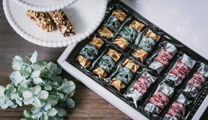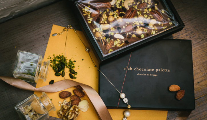 見た目が綺麗で贈り物に最適なパレット型のチョコレート。 アプリコットやレーズン、アーモンド、ピスタチオなどが 一口ごとに違う味、食感を生み出します。